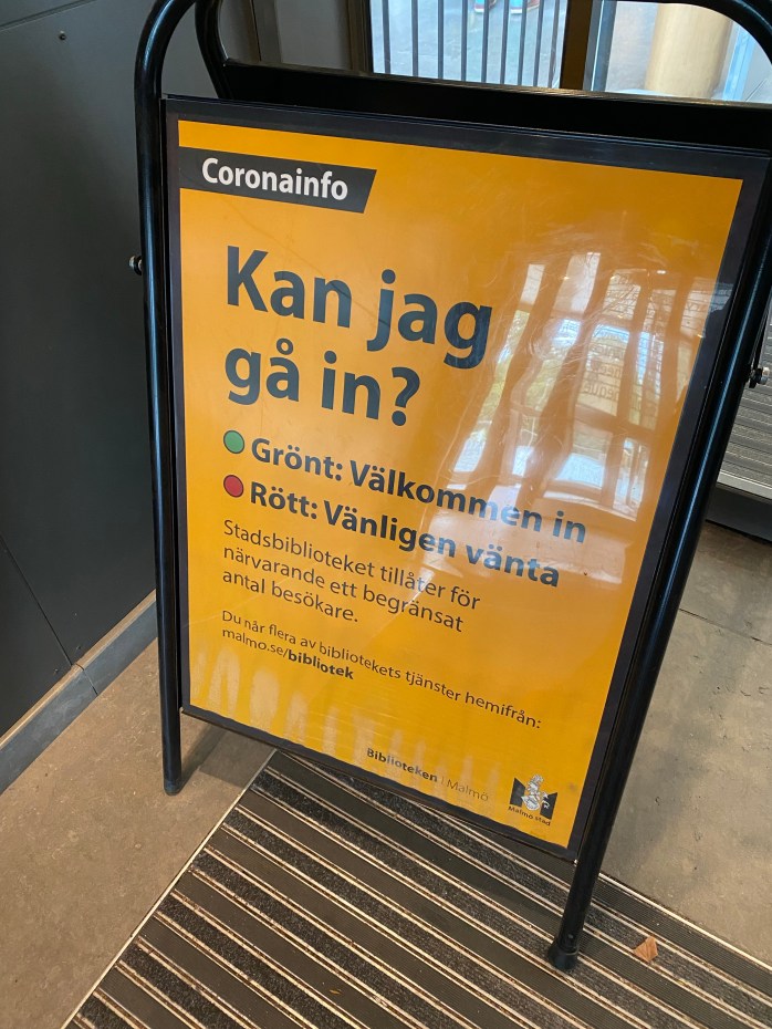 På Malmö stadsbibliotek råder det fortfarande strikt coronarestriktion. Du får enbart komma in och låna böcker, inte sitta och läsa eller göra annat. Dessutom måste det vara relativt få i huset, annars får man vänta utanför. Jag fick grönt ljus. Tänker på allegorin kring grönt och rött ljus. Här råder ingen åldersrasism, alla är välkomna. Det enda som ger rött ljus är om det är för många människor på plats samtidigt, inte hur gammal du är.
