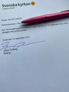 Några minuter senare och efter ett underbart möte med biskopen (mötets innehåll behåller jag för mig själv) går jag därifrån med ett leende. Den inre kallelsen matchar den yttre, jag är nu prästkandidat för Lunds stift och kommer med all sannolikhet att efter något års studie att vigas till präst.