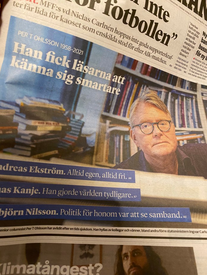 Jag träffade Per T Ohlsson vid två tillfällen. Båda gångerna var han deltagare i en debatt på scen under stora konferenser. Vid båda tillfällena bedyrade jag vid efterföljande kaffepaus min tacksamhet för hans vassa penna och duktiga debattstil. Åren går och tyvärr är avståndet från Östergötland till Malmö långt. Det blev alltför sällan jag fick läsa hans artiklar och nu är vi snart i nutid. År 2017 börjar jag läsa Sydsvenskan mer regelbundet och det är också efter det som min ritual befästs. Jag börjar följa Per T Ohlsson söndagskrönikor och imponeras över den intellektuella nivån, det historiska kunnandet och det tydliga ställningstagandet med välgrundade argument. Varje krönika bjöd dessutom på referenslitteraturhänvisningar. Oerhört ovanligt i tidningsvärlden att erbjuda läsaren referenser och tips på fördjupad läsning. Vecka ut och vecka in levererades dessa högklassiska krönikor, fram till nu.