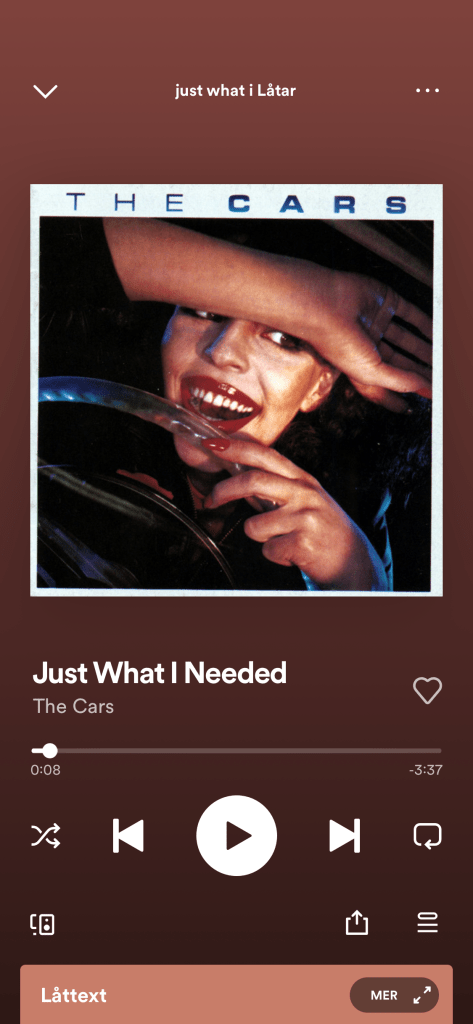 När jag sedan kommer in i lägenheten igen sätter jag på The Cars låt från 1978 ”Just what I needed”. Det märkliga är att jag inte har lyssnat på den på flera år, men ändå haft den i huvudet på ”repeat” hela morgonen.