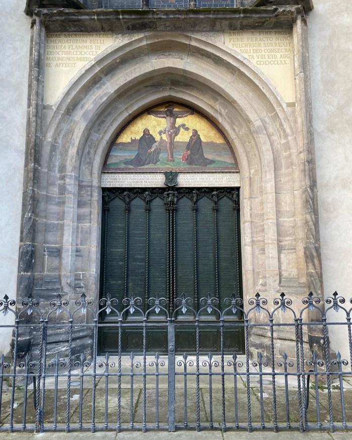 Då jag tar min sista morgonjogg måste jag naturligtvis springa förbi porten på Slottskyrkan där Luther spikade upp sina katekeser den 31 okt 1517. En stund i vår världshistoria som många definierar som startpunkten för reformationen. Det berättas i boken ”Gustav II Adolf. Hans liv och bragder. Berättade för barn och ungdom”, Anna Maria Roos fascinerande berättelse från 1916 som jag just nu har i en flyttlåda i ett förråd i Landskrona, att när Gustav II Adolf drog fram genom Europa från fältslag till fältslag var han ju tvungen, som den protestantiska härföraren han var, att besöka denna plats. Han var tvungen att se porten där allt började. Han var tvungen att för sina bundsförvanter förmedla att den protestantiska enheten var stark och att han var dess ledare och var kunde detta bedyras, om inte i Wittenberg vid porten där allt började.