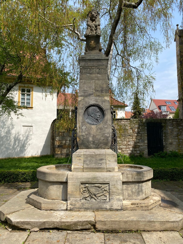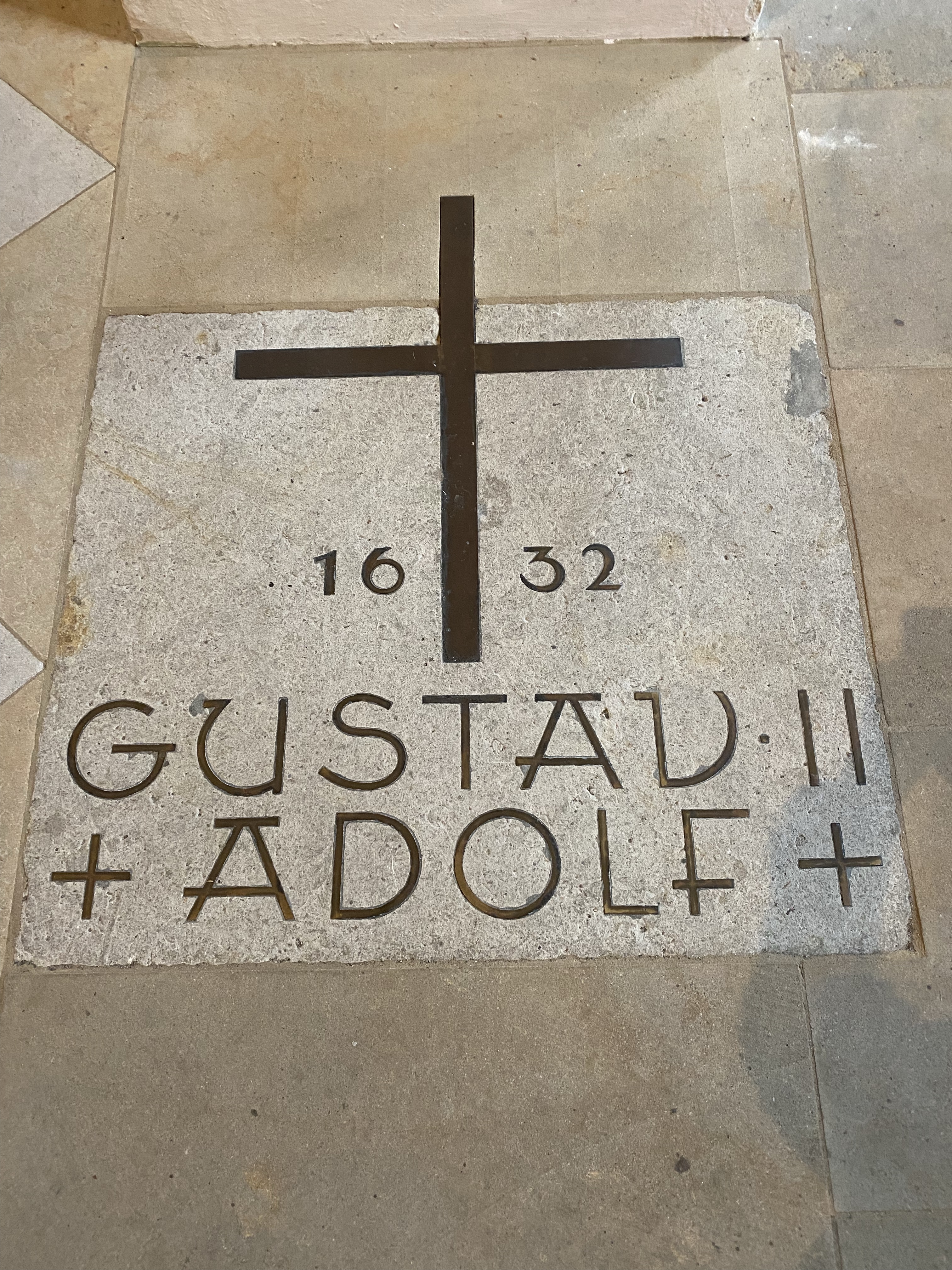 Då vi lämnar Predigerkirche i Erfurt, jag och några av mina reskamrater, efter att ha besökt Mäster Eckhardts kyrka, denna dominikanermunk och mystiker som bland annat var en stor inspirationskälla till Dag Hammarskjöld, och således även till mig, ser jag av en slump ett huvud på ett minnesmonument som står utanför kyrkan. Min initiala tanke kring att det kan vara ett minnesmonument över ”lejonet från Norden” visar sig stämma. På en gräsplätt på ena sidan av kyrkan, mitt i Erfurts gamla stadsdel, står ett minnesmonument över Sveriges konung. En svensk konung som för vissa kanske är bortglömd i Sverige, eller i alla fall på sin höjd ihågkommen som inspiration till Gustav Adolfbakelsen. Här nere är inte den svenska konungen en inspiratör till en bakelse, här är han räddaren av den protestantiska rörelsen. Monumentet har ett lejon på toppen, svärd och en Bibel avbildad längst ned. I mitten finns namnet Gustav Adolf tydligt ingraverat och konungens ansikte avbildat.