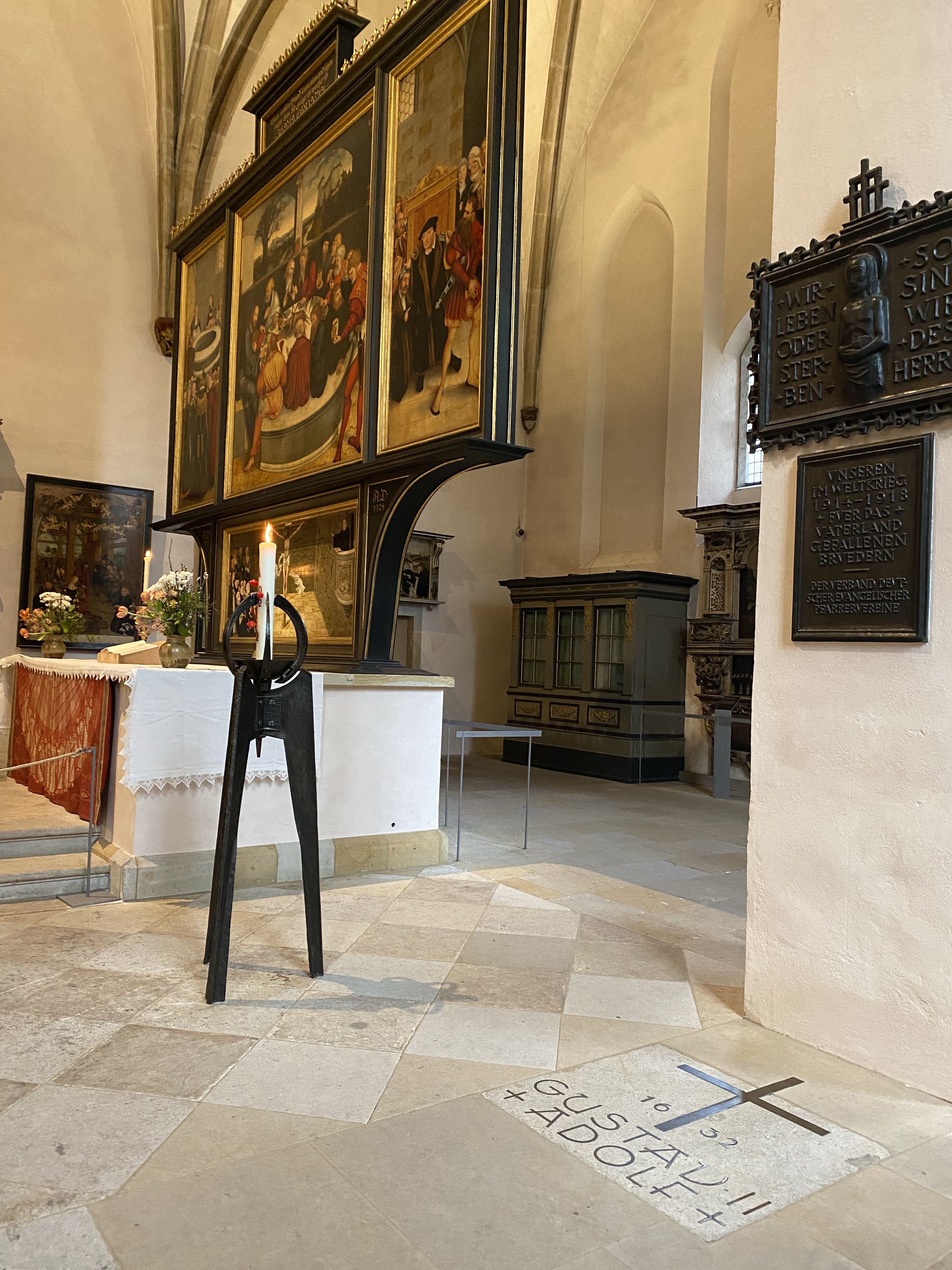 Då vi har tagit oss till Wittenberg, efter studiebesöken i Eisleben och Erfurt, deltar vi i veckoslutets Bachkonsert i Stadskyrkan i Wittenberg. Jag sitter och njuter av musiken och vilar ögonen på altartavlan. Altaruppsatsen är från Luthers speciella målare, Cranach, och hans målarverkstad. Målningen, som säkerligen Luther själv har varit med och diskuterar dess innehåll kring, kom på plats året efter Luthers död. Bilden på sockeln visar hur Guds ord förkunnas. Det är Luther själv som är i predikostolen och med vänstra handen på Bibeln och med den högra handen pekandes på Jesus är det tydligt att det är Kristus som Luther förkunnar om. I den församling som lyssnar på Luther noterar jag Katarina von Bora och troligtvis några av deras gemensamma barn. Även Lukas Cranach, målaren själv, är avbildad. Jag och min bänkkamrat resonerar lite kring var Gustav Adolfs minnesplatta finns. Efter slaget vid Lützen och konungens död låg nämligen konungens lik i denna kyrka några dagar för att Wittenbergs medborgare kunde säga farväl en sista gång till dess ledare och härförare. Under sista musikstycket ser jag ned på marken bredvid altaruppsatsen och noterar det svarta korset. Även om avståndet från där jag sitter är betydande anar jag texten i nederkanten. Det är minnesplattan, placerad precis bredvid altaruppsatsen.