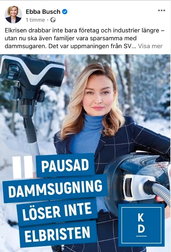 Med det här som grund kan man inte låta bli att reflektera lite över det här med att sitta i regering kontra att vara i opposition. Det var ju inte många månader sedan, vår nuvarande näringsminister gick ut som oppositionspolitiker och kritiserade den dåvarande regeringens liknande budskap som hon själv höll under dagens presskonferens/seminarie. Då åskådliggjorde hon det genom att ”pausad dammsugning löser inte elbristen”. Idag sa hon exakt samma sak, dvs det är viktigt för oss alla att pausa dammsugning när det är så här tuffa tider med elen. Det tydliggör bara att det är en sak att vara oppositionspolitiker och en annan att sitta i regeringen.