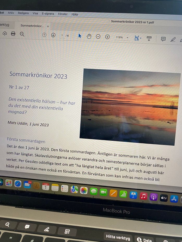 Idag är det den 1 juni år 2023. Den första sommardagen. Äntligen är sommaren här. Vi är många som har längtat. Skolavslutningarna avlöser varandra och semesterplanerna börjar sättas i verket. Per Gessles odödliga text om att ”ha längtat hela året” till juni, juli och augusti bär både på en önskan men också en förväntan. En förväntan som kan infrias men också bli något helt annat än vad man har längtat efter. För så är det i livet, allt blir inte alltid vad man har tänkt sig. Det blev något annat. När det där händer, när livet blir något annat, gäller det att ha bottnat i en existentiell mognad. Livet är inte alltid rättvist och mycket kan förändras snabbt. Att ha en existentiell mognad är i min värld att veta hur jag hanterar livets upp- och nedgångar. Om detta handlar min första sommarkrönika om. Välkommen till att ta del av mina tankar.