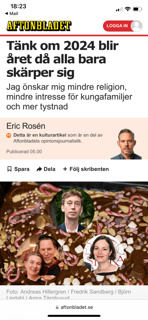 Jag slöläser Aftonbladet på deras hemsida. Fastnar för en kulturjournalistisk artikel. Det är en journalist som heter Erik Rosén som skriver om en önskelista han har inför år 2024. Så här skriver han bland annat,