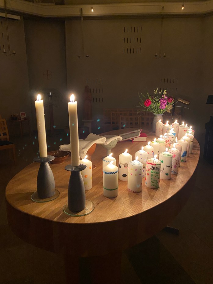 Jag tar en nattlig promenad när alla har gått och lagt sig. Vi hade en underbar sen kvällsmässa med konfirmandernas egenskapade ljus på altarets mitt. Som präst fick jag celebrera nattvarden och det var en fin stund som jag bär med mig länge. Vi samlades alla runt omkring altaret i en stor ring vid utdelandet. I dess mitt stod deras ljus och brann och lyste upp rummet.