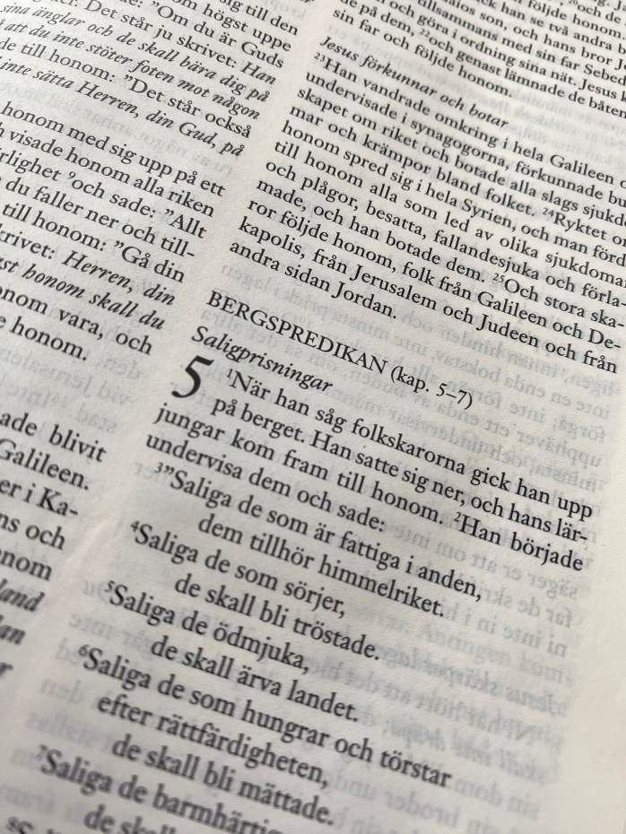 Ibland nördar jag ned i något. Så där riktigt fördjupar mig och läser allt jag kommer åt i ämnet eller frågan. Just nu nördar jag ned i Jesus bergspredikan. Ni vet talet Jesus höll enligt Matteusevangeliet på ett berg vid Galileiska sjön. Det är ett så kallat undervisande tal och kan närmast beskrivas som en sammanfattning av kärnan i Jesus lära.