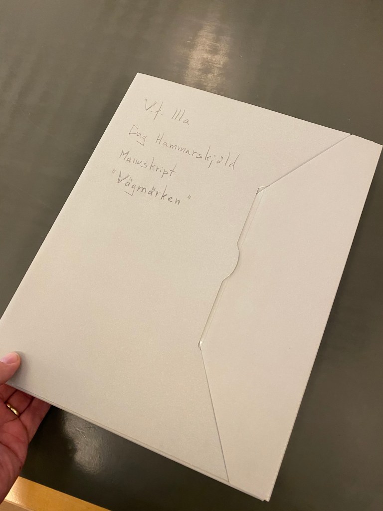 Sagt och gjort. För ett halv år sedan bokade jag in materialet från KB:s arkiv. Originalet av Vägmärken, brevkorrespondensen med Martin Buber, innehållet i den väska han hade med sig på planet och det material han lämnade kvar i Sture Linners rum i Leopoldville, Kongo, innan avfärden till Ndola. Allt skulle plockas fram till mig för att ta del av i Specialläsesalen. Jag behövde bara boka in ett datum…jag valde med omsorg…den 5:e juni för då hade jag fyllt 56 år.