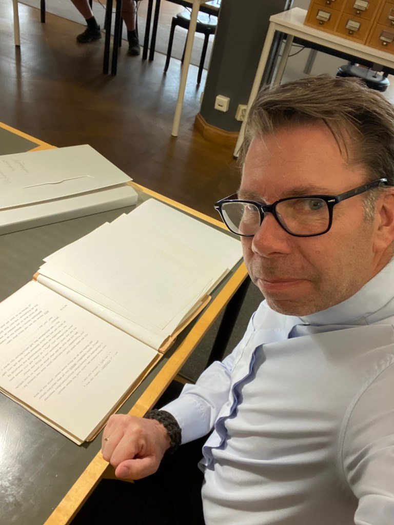 I torsdags hängde jag så på låset in till Specialläsesalen. Efter att vakten kontrollerat mitt id och lånekort gick jag fram till nästa sluss där utlämningsdisken var. Hon som tog emot mig frågade om vilken av de fem lådorna som jag beställt upp jag ville börja med. För mig fanns det ingen tvekan, andäktigt svarade jag att jag ville börja med att ta del av ”manuskriptet”.
