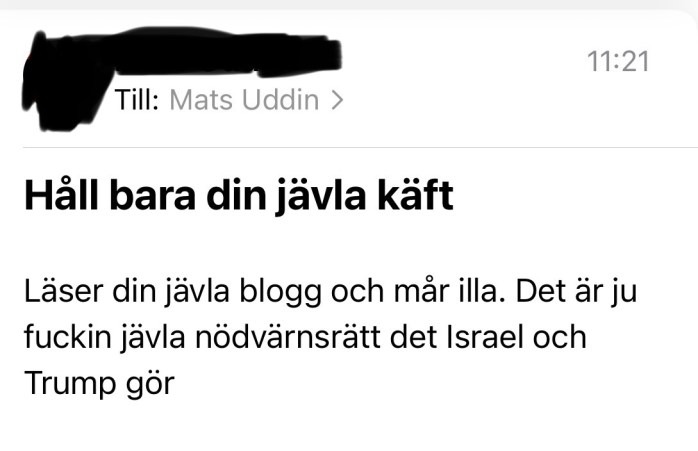 En annan anledning är att efter mitt förra inlägg fick jag några DM och SMS som gjorde mig bekymrad. Det var främst meddelanden från okända som läser min blogg men även människor som är bekanta för mig. Det var åsikter som, ”Håll käft med din jävla blogg”. ”Hur kan du försvara Mullorna i Iran”. ”Din jävla vänsteridiot, USA gör världen en tjänst när de bombar Iran.” ”Hur kan du försvara folkrätten som bara finns till för att värna diktatorer.” Det fanns ytterligare åsikter men jag låter dessa bero. Mitt blogginlägg som skapade denna irritation kan i sin helhet läsas HÄR.