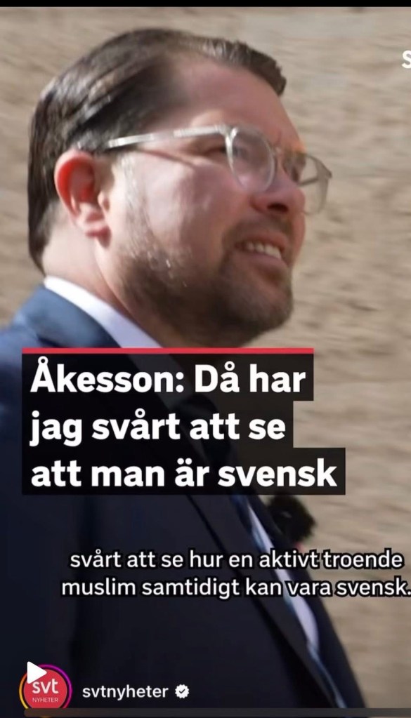 I helgen såg jag en dokumentär på TV där partiledaren för SD säger att han har rätt att avgöra hur varje muslim tänker och tycker. Han är fast i att kategorisera, generalisera och döma andra. Han säger att man inte kan vara både svensk och muslim. Hans politiska livsluft är att skapa konflikter mellan ”vi och dom”. Peka ut ”de andra” som dåliga för han vet minsann hur de andra är. Han är dessutom så fast i vad jag skulle tolka som nynazistiskt tänk att för honom är det normalt att prata om att judar har en särskild skallform.