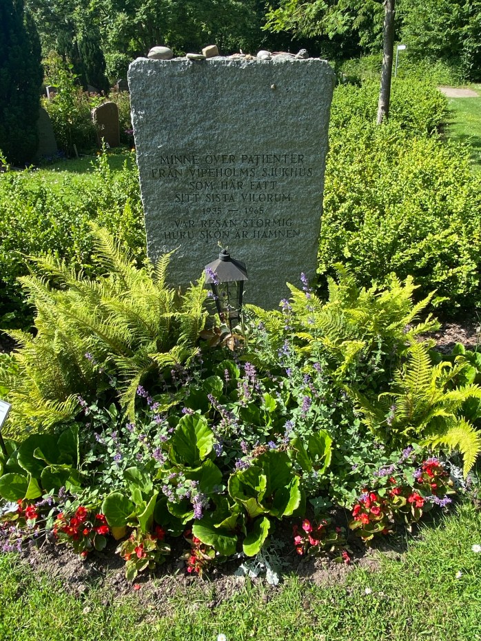 Vi avslutar vår kyrkogårdsvandring vid minnesstenen över Vipeholms patienter. När vi fördjupar oss i Vipeholmsexperimentet och de så kallade medicinska undersökningar som de som då kallades ”svårskötta obildbara sinnesslöa” utsattes för känns människans grymhet i ben och märg. Medan Anders läser högt ur en historiebeskrivning över dessa undersökningar bär jag en inre fråga om vi som bär mänskligheten och kallas människor aldrig lär oss av historien. Grymheter som vi utsätter andra människor för verkar aldrig ta slut. Kyrie eleison! På minnesstenen ligger en hjärtformad sten som har sprickor och är sönder. Känns passande samtidigt som det är sorgligt.