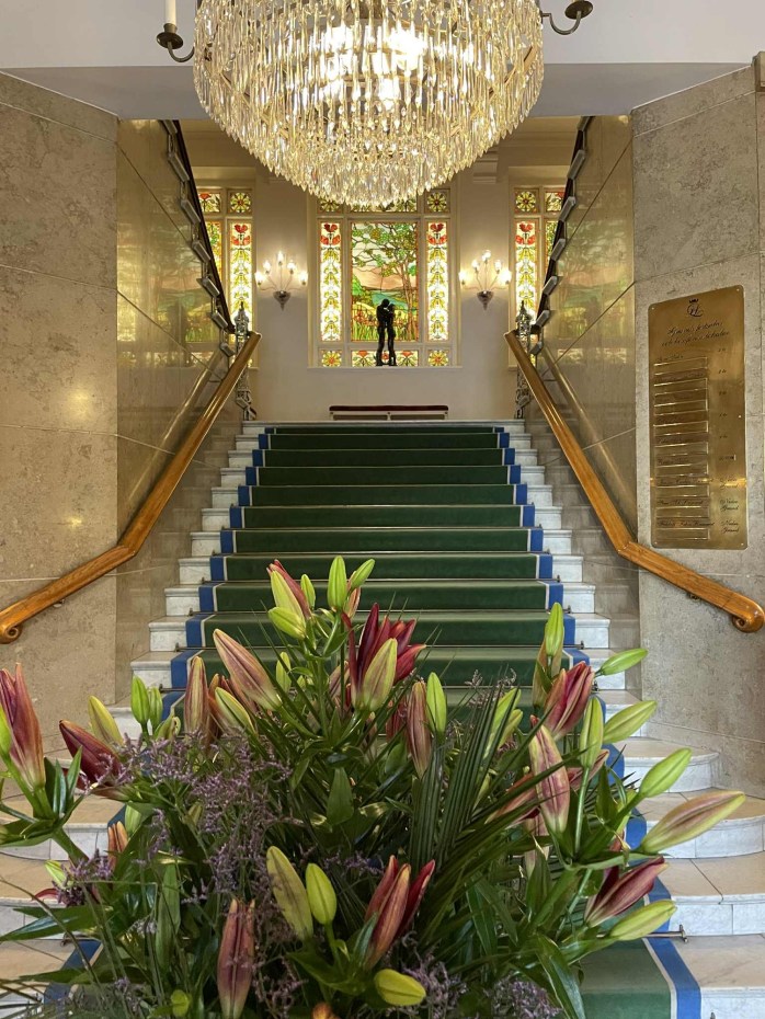 Många gånger sedan bokningen gjordes har jag varit nära att försäga mig men lyckats hålla tyst. Nu blev det som jag hade tänkt mig och efter att vi på landet haft frukost i det gröna och även läst några kapitel ur mitt senaste manus så berättade jag. Hotellpaket med övernattning och middag…dock sa jag inte vart…utan det fick hon veta först när vi gick upp för Grands tjusiga trappor.