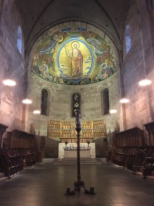 Jag anar korstolarna under den ståtliga mosaikmålningen. Jag bestämmer mig för att ta vänstervarvet runt och ser först det astronomiska uret och tar mig sedan upp till Högkoret. Innan jag åter vänder tillbaka går jag ned i kyrkovalvet och ser de pampiga stenstatyerna. Innan jag lämnar kyrkan läser jag dagens bibelord i den uppslagna Bibeln och går sedan in i mittskeppet och sätter mig en stund på en av stolarna i den stora mittgången för att insupa atmosfären. I mitt huvud virvlar det tankar från dagens konferens men även utmaningar jag har med mig från hemmaplan. Lyssnar och sneglar på Jesus bild på den stora mosaikmålningen längst fram.
