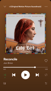 Trycker igång en av mina andra spellistor på Spotify. Jon Brions korta men underbara låt från filmen ”Lady Bird” går igång. Pianospelande när det är som bäst. Jag insuper tonerna med alla mina sinnen. Det enda felet med låten är att den enbart är 1.24 minuter lång.