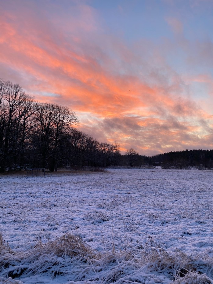 När jag springer i eklandskapet lyser snön vitt och solen håller på att gå upp bakom träden. Jag njuter. Som boendes i Skåne är det ovanligt för mig med snö och minusgrader så jag njuter för fullt av det vackra och friska. När jag gick ut ur tåget från Malmö vid ankomsten till Linköping igår kväll var kylan det som slog emot mig direkt. Då njöt jag inte direkt, nu under löpturen på morgonen efteråt är det njutning jag känner. Det skiftar fort.