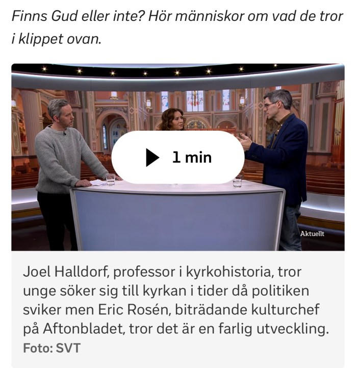 Jag läste också Mattias Oscarssons kritiska artikel i Sydsvenskan förra året och reflekterade över hur dessa ateister verkar kalla ”vi” som de som inte är kristna och att det är detsamma som hela samhället. Deras identifikation med ”vi” gjorde även Eric Rosén i en debatt med Joel Halldorf i en debatt i Aktuellt i veckan. Utgångspunkten var att ökningen av inträde till Svenska kyrkan sker och att ungdomsbarometern spås trenda Jesus som influeraren nummer 1 under år 2025. Att Aktuellt ens hade 8 minuters debatt mellan ateisten Rosén och professorn Halldorf om tron på Gud är ändå något stort i vår samtid.